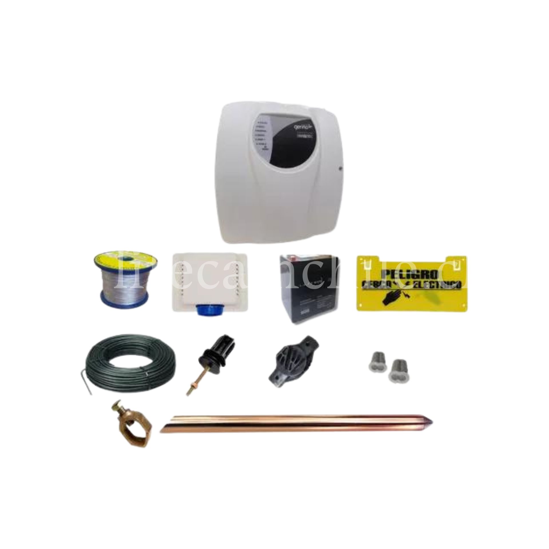 Este Kit incluye: 1 Energizador Volshock 10.000 Volts, 1,5 Joules. con receptor inalámbrico incorporado. Incluye 1 control remoto para encendido y apagado. 1 Gabinete Metálico Formados de una sola pieza perfilada y doblada. Parte posterior unida a los laterales a través de Perfil especial formando una zona estanca protegida. Protección para humedad. 1 Sirena 15 w con baliza y gabinete 1 Batería Ciclo prolongado recargable 12v 7 a 1 Rollo de 50 metros. Cable de alta aislación Hometec 1.6mm, cable de alta conductividad y flexibilidad 1 Barras Copperweld + 1 Abrazadera de Bronce 12 Poste de paso con 6 perforaciones y tratamiento anticorrosivo, con aisladores de paso. 8 Poste Tensor con 6 perforaciones y tratamiento anticorrosivo con aisladores de tensión. 2 Carrete 500 mts. De piola acero galvanizado Ø1.0mm Casquillos de fijación 1,5 de aluminio 6 Letrero de advertencia resistentes a la exposición solar, fabricados en material acrílico de color amarillo, cumplen la norma SEC.